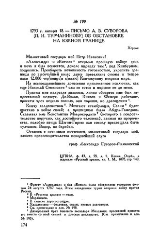 Письмо А.В. Суворова [П.И. Турчанинову] об обстановке на южной границе. Херсон. 1793 г. января 18 // ЦГВИА, ф. 43, д. 58, л. 1. Копия. Опубл. в журнале «Русский архив», кн. I, М., 1878, стр. 140.