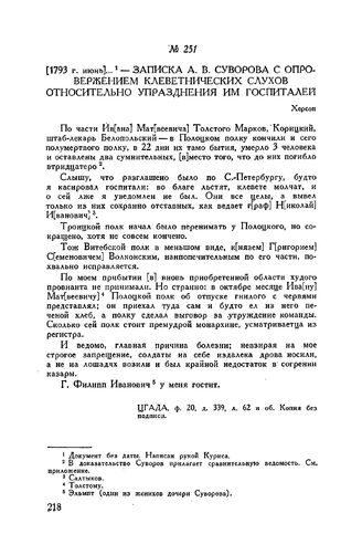 Записка А.В. Суворова с опровержением клеветнических слухов относительно упразднения им госпиталей. Херсон. [1793 г. июнь] // ЦГАДА, ф. 20, д. 339, л. 62 и об. Копия без подписи.