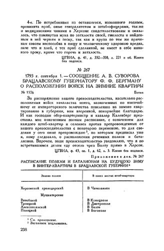 Сообщение А.В. Суворова брацлавскому губернатору Ф.Ф. Бергману о расположении войск на зимние квартиры. Ботня. 1793 г. сентября 1 // ЦГВИА, ф. 43, on. 1, д. 62, л. 3. Копия без подписи.