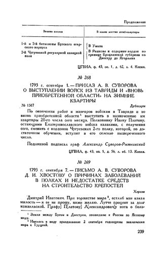 Приказ А.В. Суворова о выступлении войск из Тавриды и «вновь приобретенной области» на зимние квартиры. Дубосары. 1793 г. сентября 1 // ЦГВИА, ф. 43, оп. 1, д. 56, л. об. 13. Копия.