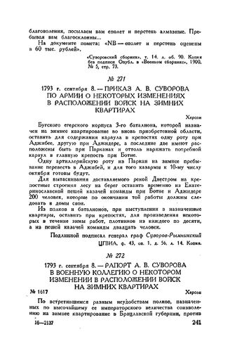 Рапорт А.В. Суворова в Военную коллегию о некотором изменении в расположении войск на зимних квартирах. Херсон. 1793 г. сентября 8 // ЦГВИА, ф. 41, д. 380-388, л. 61. Подлинник.