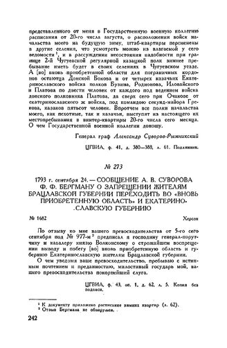 Сообщение А.В. Суворова Ф.Ф. Бергману о запрещении жителям Брацлавской губернии переходить во «вновь приобретенную область» и Екатеринославскую губернию. Херсон. 1793 г. сентября 24