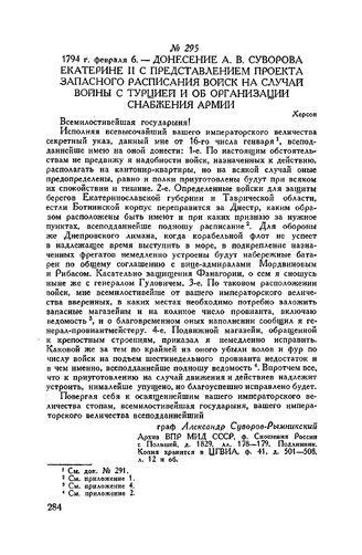 Донесение А.В. Суворова Екатерине II с представлением проекта запасного расписания войск на случай войны с Турцией и об организации снабжения армии. Херсон. 1794 г. февраля 6 // Архив ВПР МИД СССР, ф. Сношения России с Польшей, д. 1829, лл. 178-179. Подлинник. Копия хранится в ЦГВИА, ф. 41, д. 501-508, л. 12 и об.
