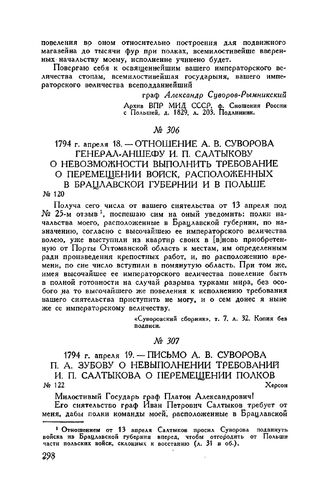 Отношение А.В. Суворова генерал-аншефу И.П. Салтыкову о невозможности выполнить требование о перемещении войск, расположенных в Брацлавской губерния и в Польше. 1794 г. апреля 18 // «Суворовский сборник», т. 7. л. 32. Копия без подписи.