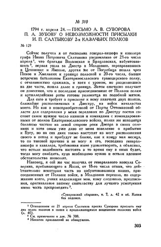 Письмо А.В. Суворова П.А. Зубову о невозможности присылки И.П. Салтыкову 2-х казачьих полков. 1794 г. апреля 24 // «Суворовский сборник», т. 7, л. 42 и об. Копия без подписи.
