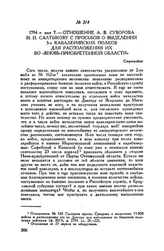 Отношение А.В. Суворова И.П. Салтыкову с просьбой о выделении 3-х кавалерийских полков для расположения их во «вновь приобретенной области». 1794 г. мая 7 // «Суворовский сборник», т. 7, л. 51 и об. Копия без подписи.