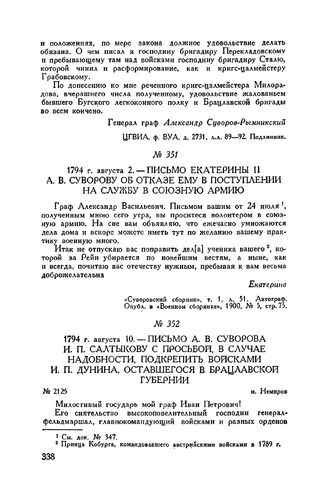 Письмо Екатерины II А.В. Суворову об отказе ему в поступлении на службу в союзную армию. 1794 г. августа 2 // «Суворовский сборник», т. 1, л. 51. Автограф. Опубл. в «Военном сборнике», 1900, № 5, стр. 75.