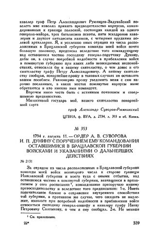 Ордер А.В. Суворова И.П. Дунину с поручением ему командования оставшимися в Брацлавской губернии войсками и указаниями о дальнейших действиях. 1794 г. августа 11 // ЦГВИА, ф. ВУА, д. 2734, л. 410. Копия.