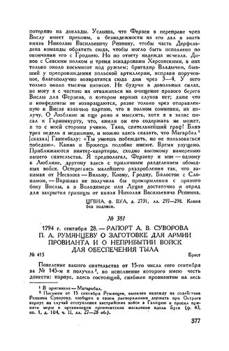 Рапорт А.В. Суворова П.А. Румянцеву о заготовке для армии провианта и о неприбытии войск для обеспечения тыла. Брест. 1794 г. сентября 28 // ЦГВИА, ф. ВУА, д. 2731, л. 185 и об. Подлинник. Частично опубл. в кн. «Суровский сборник». Варшава, 1900, стр. 219.