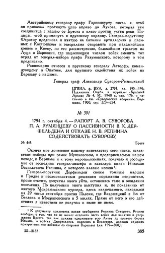 Рапорт А.В. Суворова П.А. Румянцеву о пассивности В.X. Дерфельдена и отказе Н.В. Репнина содействовать Суворову. Брест. 1794 г. октября 4 // ЦГВИА, ф. ВУА, д. 2731. лл. 197-198. Подлинник. Опубл. в журнале «Красный Архив» № 4, М., 1940 г., стр. 177-178, и частично в кн. «Суворовский сборник». Варшава, 1900, стр. 226.
