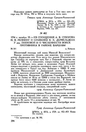 Из сообщения А.В. Суворова Н.В. Репнину о сражении В.X. Дерфельдена у дер. Попковой и о численности войск противника в районе Варшавы. м. Кобылка. 1794 г. октября 19 // ЦГВИА, ф. ВУА, д. 2729, лл. 452-453. Копия без подписи.