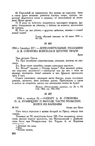Рапорт А.В. Суворова П.А. Румянцеву о выходе части польских войск из Варшавы. Лагерь при Праге. 1794 г. октября 23 // ЦГВИА, ф. ВУА, д. 2731, л. 291. Подлинник. Опубл. в журнале «Красный Архив» № 4, М., 1940 г., стр. 185, и частично в кн. «Суворовский сборник». Варшава, 1900, стр. 233.
