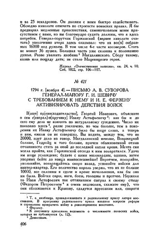 Письмо А.В. Суворова генерал-майору Г.И. Шевичу с требованием к нему и И.Е. Ферзену активизировать действия войск. 1794 г. [ноября 4] // ЦГВИА, ф. 43, оп. 1, д. 107, л. 11 и об. Копия.