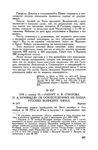 Рапорт А.В. Суворова П.А. Румянцеву об освобожденных из плена русских воинских чинах. Варшава. 1794 г. ноября 13 // ЦГВИА, ф. ВУА, д. 2731, л. 421. Подлинник.