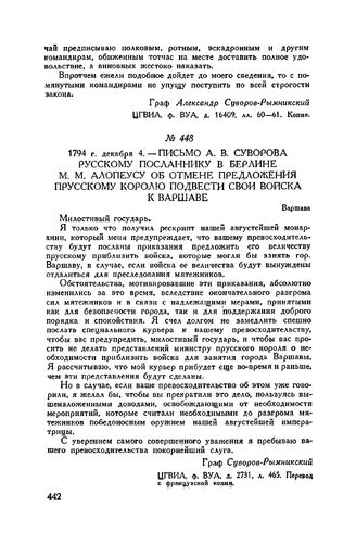Письмо А.В. Суворова русскому посланнику в Берлине М.М. Алопусу об отмене предложения прусскому королю подвести свои войска к Варшаве. Варшава. 1794 г. декабря 4
