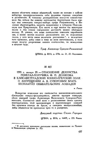 Отношение дежурства генерал-поручика Ф.П. Денисова в Елисаветградский конно-егерский полк о запрещении А.В. Суворовым брать бесплатно обывательских лошадей. м Рыква. 1795 г. января 29