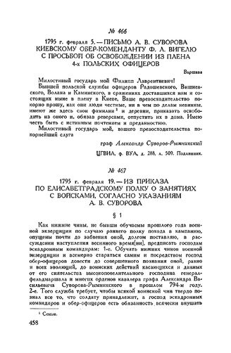 Письмо А.В. Суворова киевскому обер-коменданту Ф.Л. Вигелю с просьбой об освобождении из плена 4-х польских офицеров. Варшава. 1795 г. февраля 5 // ЦГВИА, ф. ВУА, д. 288, л. 509. Подлинник.