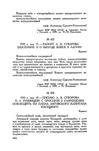 Рапорт А.В. Суворова Екатерине II о выходе войск в лагери. Варшава. 1795 г. мая 17 // Архив ВПР МИД СССР, ф. Сношения России с Польшей, д. 1839, л. 79. Подлинник.