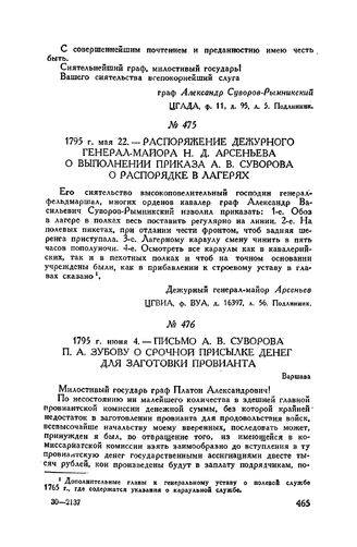 Распоряжение дежурного генерал-майора Н.Д. Арсеньева о выполнении приказа А.В. Суворова о распорядке в лагерях. 1795 г. мая 22