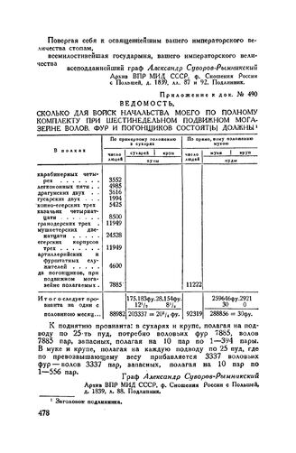 Приложение к рапорту А.В. Суворова Екатерине II. Ведомость, сколько для войск начальства моего по полному комплекту при шестинедельном подвижном магазине волов, фур и погонщиков состоят[ь] должны // Архив ВПР МИД СССР, ф. Сношения России с Польшей, д. 1839, л. 88. Подлинник.