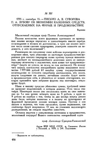Письмо А.В. Суворова П.А. Зубову об экономии казенных средств, отпускаемых на фураж и продовольствие. Варшава. 1795 г. сентября 15 // Архив ВПР МИД СССР, ф. Сношения России с Польшей, д. 1839, л. 241. Подлинник.