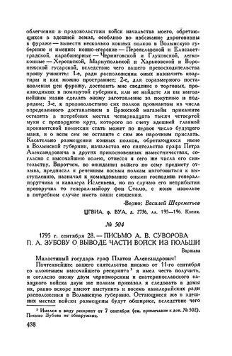 Письмо А.В. Суворова П.А. Зубову о выводе части войск из Польши. Варшава. 1795 г. сентября 28 // Архив ВПР МИД СССР, ф. Сношения России с Польшей, д. 1839, л. 120. Подлинник.