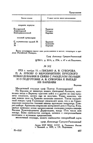 Письмо А.В. Суворова П.А. Зубову о мероприятиях прусского командования в связи с разделом Польши и о подготовке А.В. Суворова к выезду из Варшавы. Варшава. 1795 г. ноября 11 // Архив ВПР МИД СССР, ф. Сношения России с Польшей, д. 1839, л. 131. Подлинник.