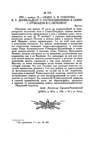 Ордер А.В. Суворова В.X. Дерфельдену с распоряжениями в связи с отъездом в С.-Петербург. Варшава. 1795 г. ноября 15