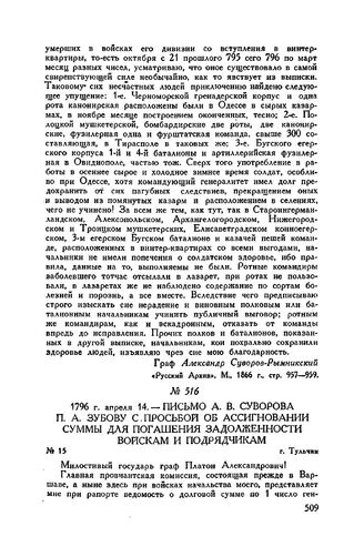 Письмо А.В. Суворова П.А. Зубову с просьбой об ассигновании суммы для погашения задолженности войскам и подрядчикам. г. Тульчин. 1796 г. апреля 14