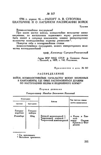 Рапорт А.В. Суворова Екатерине II о лагерном расписании войск. Тульчин. 1796 г. апреля 16 // Архив ВПР МИД СССР, ф. Сношения России с Польшей, д. 1839, л. 142. Подлинник.