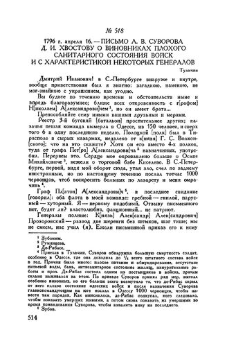 Письмо А.В. Суворова Д.И. Хвостову о виновниках плохого санитарного состояния войск и с характеристикой некоторых генералов. Тульчин. 1796 г. апреля 16 // «Суворовский сборник», т. 10, лл. 8-9. Подлинник.