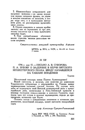 Письмо А.В. Суворова П.А. Зубову о задержке в Керчи Вятского мушкетерского полка ввиду начавшейся на Тамани эпидемии. Тульчин. 1796 г. мая 17 // Архив ВПР МИД СССР, ф. Сношения России с Польшей, д. 1839, л. 245. Подлинник.