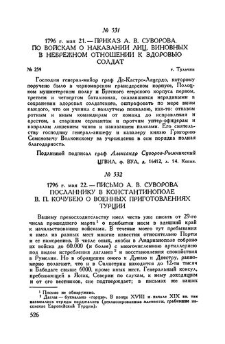 Приказ А. В. Суворова по войскам о наказании лиц, виновных в небрежном отношении к здоровью солдат. г. Тульчин. 1796 г. мая 21