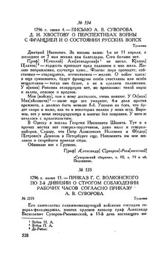 Письмо А.В. Суворова Д.И. Хвостову о перспективах войны с Францией и о состоянии русских войск. Тульчин. 1796 г. июня 4 // «Суворовский сборник», т. 10, л. 19 и об. Подлинник.