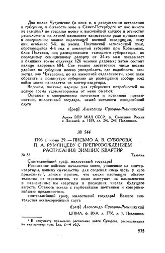Письмо А.В. Суворова П.А. Румянцеву с препровождением расписания зимних квартир. Тульчин. 1796 г. июня 29
