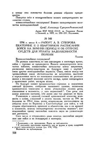 Рапорт А.В. Суворова Екатерине II о квартирном расписании войск на зимний период и об отпуске средств для уплаты задолженности полкам. Тульчин. 1796 г. июля 4 // Архив ВПР МИД СССР, ф. Сношения России с Польшей, д. 1839, лл. 166-167. Подлинник.