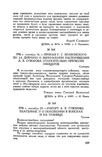 Приказ Г.С. Волконского по 2-й дивизии о выполнении распоряжения А.В. Суворова относительно прически офицеров. Слободзея. 1796 г. сентября 16 // ЦГВИА, ф. ВУА, д. 16401, л. 42. Копия.