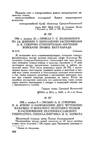 Приказ Г.С. Волконского по 2-й дивизии о выполнении распоряжения А.В. Суворова относительно изучения войсками правил вахт-парада. Слободзея. 1796 г. октября 23