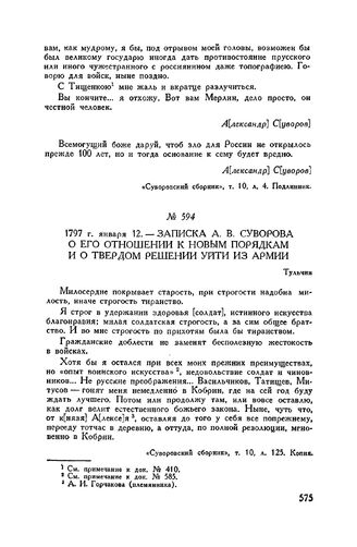 Записка А.В. Суворова о его отношении к новым порядкам и о твердом решении уйти из армии. Тульчин. 1797 г. января 12 // «Суворовский сборник», т. 10, л. 125. Копия.