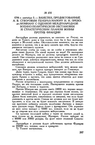 Заметки, продиктованные А.В. Суворовым генерал-майору И.И. Прево-де-Аюмиану с оценкой международной военно-политической обстановки и стратегическим планом войны против Франции. 1798 г. сентября 5 // ЦГВИА, ф. ВУА, д. 315, л. 1-2. Перевод с французской копии. Опубл. в сборнике «Генералиссимус Суворов», М., 1947, стр. 222-223.