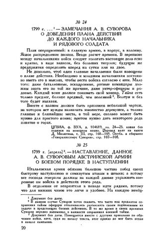 Замечания А.В. Суворова о доведении плана действий до каждого начальника и рядового солдата. 1799 г. // ЦГВИА, ф. ВУА, д. 104619, лл. 24-25, копия без подписи на немецком языке. Перевод взят из книги Д. Милютина, т. III, стр. 168-1б9. Опубл. в сборнике «Генералиссимус Суворов», стр. 107-108.