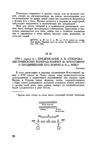 Предписание А.В. Суворова австрийскому генерал-майору Ф. Вукасовичу о продвижении его корпуса к реке Изео. Валеджио. 1799 г. апреля 6 // ЦГВИА, ф. ВУА, д. 104618, копия на немецком языке. Перевод.