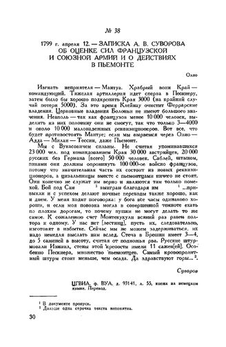 Записка А.В. Суворова об оценке сил французской и союзной армий и о действиях в Пьемонте. Олио. 1799 г. апреля 12 // ЦГВИА, ф. ВУА, д. 93141, л. 55, копия на немецком языке. Перевод.