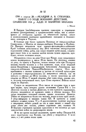 Реляция А.В. Суворова Павлу I о ходе военных действий, сражении на р. Адде и занятии Милана. г. Милан. 1799 г. апреля 20 // ЦГВИА, ф. 26, оп. 152, д. 532, лл. 10-19, подлинник. Частично опубл. с копии в сборнике «Генералиссимус Суворов», стр. 227-230, и полностью, с некоторыми отклонениями от текста подлинника, Е. Фукс, ч. II, стр. 36-47.