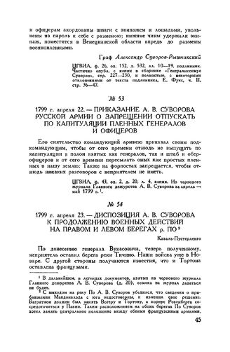 ЦГВИА, ф. 43, оп. 2, д. 20, л. 4, копия. Из чернового журнала Главного дежурства А. В. Суворова за апрель-май 1799 г.