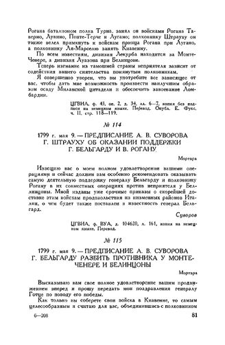Предписание А.В. Суворова Г. Бельгарду разбить противника у Монте-Ченере и Белинцоны. Мортара. 1799 г. мая 9 // ЦГВИА, ф. ВУА, д. 104620, л. 163, копия на немецком языке. Перевод.