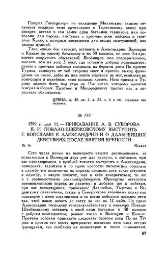 Приказание А.В. Суворова Я.И. Повало-Швейковскому выступить с войсками к Александрии и о дальнейших действиях после взятия крепости. Кандия. 1799 г. мая 11