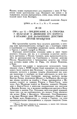 Главная Русские полководцы Русские полководцы. А.В. Суворов А.В. Суворов. Т. IV. 1799-1800 Документы Предписание А.В. Суворова Г. Бельгарду о движении его корпуса в Ита...
