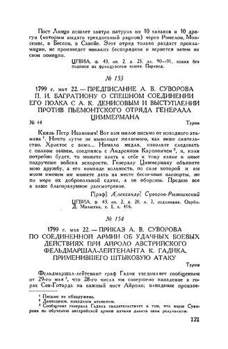 Приказ А.В. Суворова по соединенной армии об удачных боевых действиях при Айроло австрийского фельдмаршал-лейтенанта К. Гадика, применившего штыковую атаку. Турин. 1799 г. мая 22 // ЦГВИА, ф. 43, оп. 2, д. 23, л. 15 и об., подлинник на немецком языке. Перевод в несколько другом варианте опубл. Е. Фукс, ч. II, стр. 228-229.