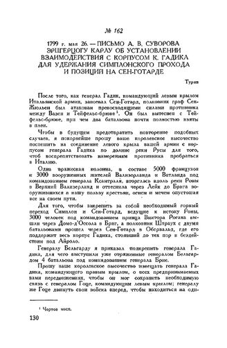 Письмо А.В. Суворова эрцгерцогу Карлу об установлении взаимодействия с корпусом К. Гадика для удержания симплонского прохода и позиций на Сен-Готарде. Турин. 1799 г. мая 26 // ЦГВИА, ф. 43, оп. 2, д. 72, л. 4 и об., копия на немецком языке. Перевод. Опубл. Е. Фукс, ч. II, стр. 258-260.